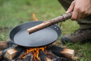 このフライパンの最大の特徴は、「現地で枝を拾ってハンドル(取っ手)にする」という極めてユニークなコンセプトにあります。購入時に届くのは、取っ手のない鉄の皿部分だけ。ハンドルを挿し込むためのソケットが付いており、キャンパーはその場にある木の枝をナイフで削って、自分だけのハンドルを作成するのです。これは単なる軽量化の工夫ではなく、「現地調達」というブッシュクラフトの醍醐味を体験するための仕掛けです。