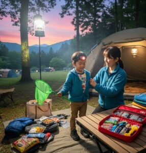 定番ですが、「虫取り網とカゴ」は男の子も女の子も大好きです。捕まえた虫を図鑑アプリで調べるのも現代的な楽しみ方ですね。また、夜の探検ごっこに使える「子供用のヘッドライト」を持たせると、それだけで大興奮してくれます。100均で売っているような光るブレスレット(サイリウム)も、迷子防止を兼ねた遊び道具として優秀です。テントのガイロープ(張り綱)に引っかかって転ぶのを防ぐための目印としてペグにつけるのもおすすめです。